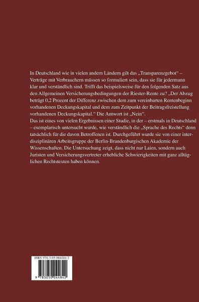 in Deutschland wie in vielen andern Ländern gilt das "Transparenzgebot" – Verträge mit Verbrauchern müssen so formuliert sein, dass sie für jedermann klar und verständlich sind. Trifft das beispielsweise für den folgenden Satz aus den Allgemeinen Versicherungsbedingungen der Riester-Rente zu? "Der Abzug beträgt 0,2 Prozent der Differenz zwischen dem zum vereinbarten Rentenbeginn vorhandenen Deckungskapital und dem zum Zeitpunkt der Beitragsfreistellung vorhandenen Deckungskapital." Die Antwort ist "Nein". Das ist eines von vielen Ergebnissen einer Studie, in der – erstmals in Deutschland – exemplarisch untersucht wurde, wie verständlich die "Sprache des Rechts" denn tatsächlich für die davon Betroffenen ist. Durchgeführt wurde sie von einer interdisziplinären Arbeitsgruppe an der Berlin-Brandenburgischen Akademie der Wissenschaften. Die Untersuchung zeigt, dass nicht nur Laien, sondern auch Juristen und Versicherungsvertreter erhebliche Schwierigkeiten mit ganz alltäglichen Rechtstexten haben können.