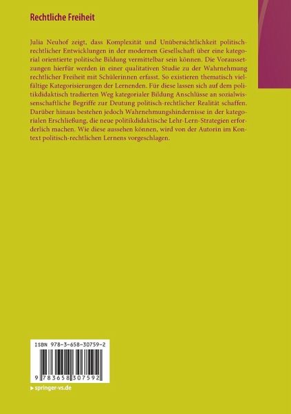 Julia Neuhof zeigt, dass Komplexität und Unübersichtlichkeit politisch-rechtlicher Entwicklungen in der modernen Gesellschaft über eine kategorial orientierte politische Bildung vermittelbar sein können. Die Voraussetzungen hierfür werden in einer qualitativen Studie zu der Wahrnehmung rechtlicher Freiheit mit Schülerinnen erfasst. So existieren thematisch vielfältige Kategorisierungen der Lernenden. Für diese lassen sich auf dem politikdidaktisch tradierten Weg kategorialer Bildung Anschlüsse an sozialwissenschaftliche Begriffe zur Deutung politisch-rechtlicher Realität schaffen. Darüber hinaus bestehen jedoch Wahrnehmungshindernisse in der kategorialen Erschließung, die neue politikdidaktische Lehr-Lern-Strategien erforderlich machen. Wie diese aussehen können, wird von der Autorin im Kontext politisch-rechtlichen Lernens vorgeschlagen.