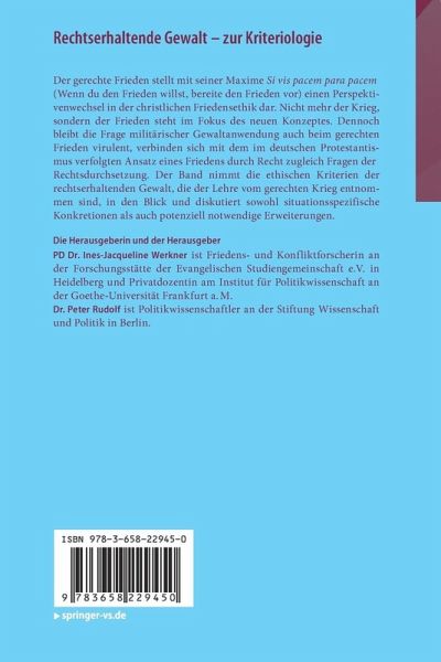 Der gerechte Frieden stellt mit seiner Maxime Si vis pacem para pacem (Wenn du den Frieden willst, bereite den Frieden vor) einen Perspektivenwechsel in der christlichen Friedensethik dar. Nicht mehr der Krieg, sondern der Frieden steht im Fokus des neuen Konzeptes. Dennoch bleibt die Frage militärischer Gewaltanwendung auch beim gerechten Frieden virulent, verbinden sich mit dem im deutschen Protestantismus verfolgten Ansatz eines Friedens durch Recht zugleich Fragen der Rechtsdurchsetzung. Der Band nimmt die ethischen Kriterien der rechtserhaltenden Gewalt, die der Lehre vom gerechten Krieg entnommen sind, in den Blick und diskutiert sowohl situationsspezifische Konkretionen als auch potenziell notwendige Erweiterungen.