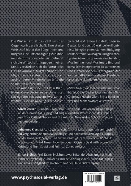 Die Arbeitsgruppe um Elmar Brähler und Oliver Decker an der Universität Leipzig führt seit 2002 im Zwei-Jahres-Rhythmus sozialpsychologische Studien zu rechtsextremen Einstellungen in Deutschland durch. Die aktuellen Ergebnisse belegen einen starken Rückgang rechtsextremer Aussagen und gleichzeitig eine Abwertung von Asylsuchenden, Musliminnen und Muslimen, Sinti und Roma. Dies interpretieren die Autorinnen und Autoren vor dem Hintergrund der "wirtschaftlichen Insellage" Deutschlands als "sekundären Autoritarismus".