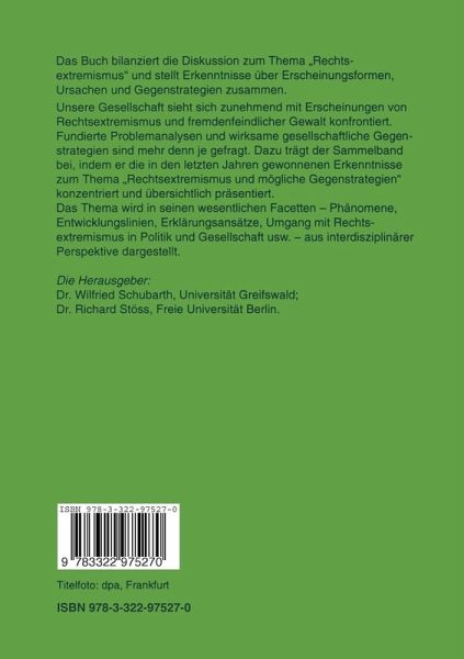 A. Einleitung: Extremismus in vergleichender Perspektive.- Extremismus - Rechtsextremismus - Linksextremismus: Einige Anmerkungen zu Begriffen, Forschungskonzepten, Forschungsfragen und Forschungsergebnissen.- Rechtsextremismus: Gegenstand - Erklärungsansätze - Grundprobleme.- B. Phänomenologie des Rechtsextremismus.- Der organisierte Rechtsextremismus in Deutschland nach 1945. Zur Entwicklung auf den Handlungsfeldern »Aktion« - »Gewalt« - »Kultur« - »Politik«.- Ideologie und Strategie des Rechtsextremismus.- Antisemitismus in Deutschland.- Rechtsextremismus und Jugend.- Rechtsextreme Orientierungen bei Jugendlichen und jungen Erwachsenen.- Das Geschlechterverhältnis im Rechtsextremismus.- Rechtsextreme Orientierungen und Wahlverhalten.- C. Gesellschaft und Politik in der Auseinandersetzung mit dem Rechtsextremismus.- Pädagogische Strategien gegen Rechtsextremismus und fremdenfeindliche Gewalt - Möglichkeiten und Grenzen schulischer und außerschulischer Prävention.- Zur Praxis der pädagogischen Arbeit mit rechtsorientierten Jugendlichen.- Ambivalenzen der politischen Kultur, intermediäre Institutionen und Rechtsextremismus.- Rechtsstaat und Rechtsextremismus.- Auswahlbibliografie.- Die Autoren.