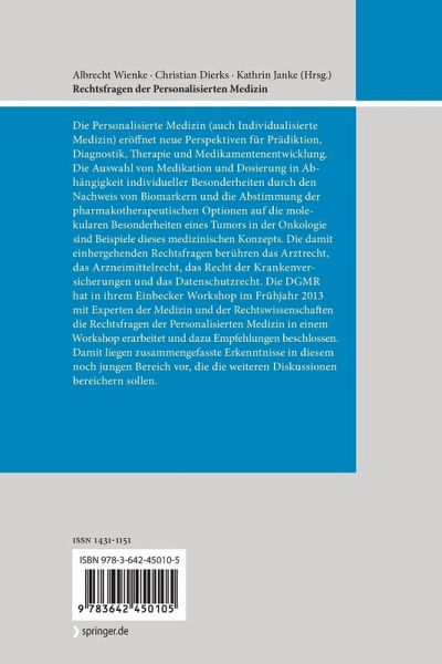 Die Personalisierte Medizin (auch Individualisierte Medizin) eröffnet neue Perspektiven für Prädiktion, Diagnostik, Therapie und Medikamentenentwicklung. Die Auswahl von Medikation und Dosierung in Abhängigkeit individueller Besonderheiten durch den Nachweis von Biomarkern und die Abstimmung der pharmakotherapeutischen Optionen auf die molekularen Besonderheiten eines Tumors in der Onkologie sind Beispiele dieses medizinischen Konzepts. Die damit einhergehenden Rechtsfragen berühren das Arztrecht, das Arzneimittelrecht, das Recht der Krankenversicherungen und das Datenschutzrecht. Die DGMR hat in ihrem Einbecker Workshop im Frühjahr 2013 mit Experten der Medizin und der Rechtswissenschaften die Rechtsfragen der Personalisierten Medizin in einem Workshop erarbeitet und dazu Empfehlungen beschlossen. Damit liegen zusammengefasste Erkenntnisse in diesem noch jungen Bereich vor, die die weiteren Diskussionen bereichern sollen.