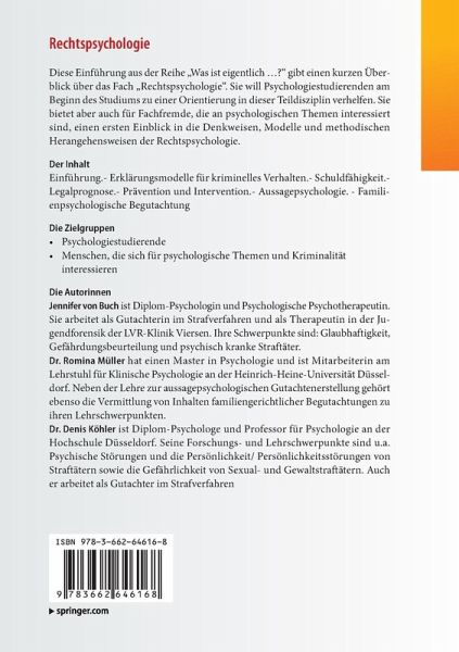 Jennifer von Buch ist Diplom-Psychologin und Psychologische Psychotherapeutin. Sie arbeitet als Gutachterin im Strafverfahren und als Therapeutin in der Jugendforensik der LVR-Klinik Viersen. Ihre Schwerpunkte sind: Glaubhaftigkeit, Gefährdungsbeurteilung und psychisch kranke Straftäter. Dr. Romina Müller hat einen Master in Psychologie und ist Mitarbeiterin am Lehrstuhl für Klinische Psychologie an der Heinrich-Heine-Universität Düsseldorf. Neben der Lehre zur aussagepsychologischen Gutachtenerstellung gehört ebenso die Vermittlung von Inhalten familiengerichtlicher Begutachtungen zu ihren Lehrschwerpunkten. Dr. Denis Köhler ist Diplom-Psychologe und Professor für Psychologie an der Hochschule Düsseldorf. Seine Forschungs- und Lehrschwerpunkte sind u.a. Psychische Störungen und die Persönlichkeit/ Persönlichkeitsstörungen von Straftätern sowie die Gefährlichkeit von Sexual- und Gewaltstraftätern. Auch er arbeitet als Gutachter im Strafverfahren