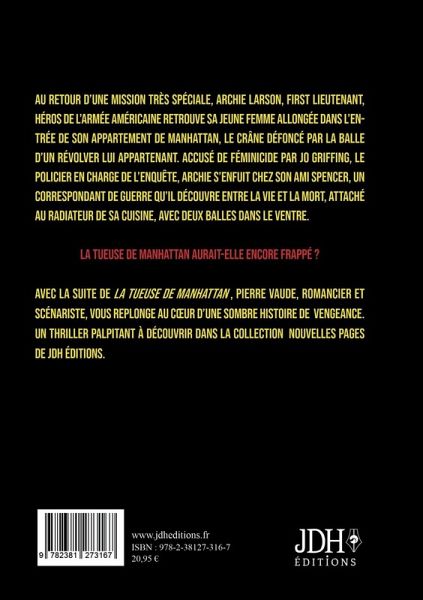 Au retour d¿une mission très spéciale, Archie Larson, First Lieutenant, héros de l¿armée américaine retrouve sa jeune femme allongée dans l¿entrée de son appartement de Manhattan, le crâne défoncé par la balle d¿un révolver lui appartenant. Accusé de féminicide par Jo Griffing, le policier en charge de l¿enquête, Archie s¿enfuit chez son ami Spencer, un correspondant de guerre qüil découvre entre la vie et la mort, attaché au radiateur de sa cuisine, avec deux balles dans le ventre. La tueuse de Manhattan aurait-elle encore frappé ? Avec la suite de « La tueuse de Manhattan », Pierre Vaude, romancier et scénariste, vous replonge au c¿ur d¿une sombre histoire de vengeance. Un thriller palpitant à découvrir dans la collection Nouvelles Pages de JDH Éditions.