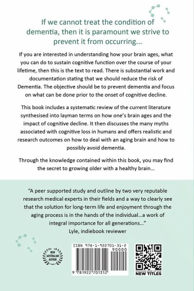 IF WE CANNOT TREAT THE CONDITION OF DEMENTIA, THEN IT IS PARAMOUNT WE STRIVE TO PREVENT IT FROM OCCURRING... If you are interested in understanding how your brain ages, what you can do to sustain cognitive function over the course of your lifetime, then this is the text to read. There is substantial work and documentation stating that we should reduce the risk of Dementia. The objective should be to prevent dementia and focus on what can be done prior to the onset of cognitive decline. This book includes a systematic review of the current literature synthesised into layman terms on how one's brain ages and the impact of cognitive decline. It then discusses the many myths associated with cognitive loss in humans and offers realistic and research outcomes on how to deal with an aging brain and how to possibly avoid dementia. Through the knowledge contained within this book, you may find the secret to growing older with a healthy brain... "A peer supported study and outline by two very reputable research medical experts in their fields and a way to clearly see that the solution for long-term life and enjoyment through the aging process is in the hands of the individual...a work of integral importance for all generations..." Lyle, indiebook reviewer