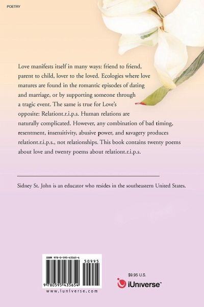 Love manifests itself in many ways: friend to friend, parent to child, lover to the loved. Ecologies where love matures are found in the romantic episodes of dating and marriage, or by supporting someone through a tragic event. The same is true for Love's opposite: Relationt.r.i.p.s. Human relations are naturally complicated. However, any combination of bad timing, resentment, insensitivity, abusive power, and savagery produces relationt.r.i.p.s., not relationships. This book contains twenty poems about love and twenty poems about relationt.r.i.p.s..