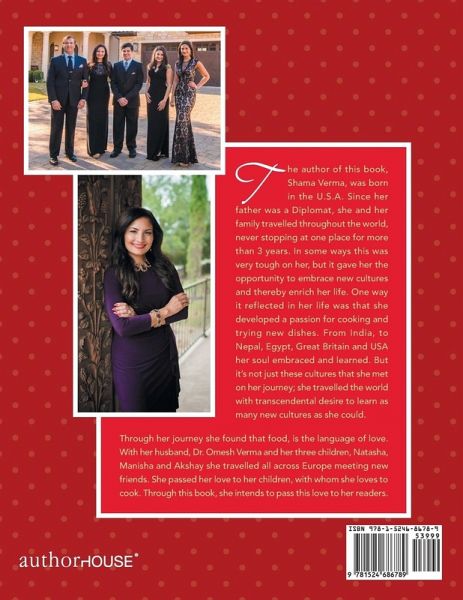 The author of this book, Shama Verma, was born in the U.S.A. Since her father was a Diplomat, she and her family travelled throughout the world, never stopping at one place for more than 3 years. In some ways this was very tough on her, but it gave her the opportunity to embrace new cultures and thereby enrich her life. One way it reflected in her life was that she developed a passion for cooking and trying new dishes. From India, to Nepal, Egypt, Great Britain and USA her soul embraced and learned. But its not just these cultures that she met on her journey; she travelled the world with transcendental desire to learn as many new cultures as she could. Through her journey she found that food, is the language of love. With her husband, Dr. Omesh Verma and her three children, Natasha, Manisha and Akshay she travelled all across Europe meeting new friends. She passed her love to her children, with whom she loves to cook. Through this book, she intends to pass this love to her readers.