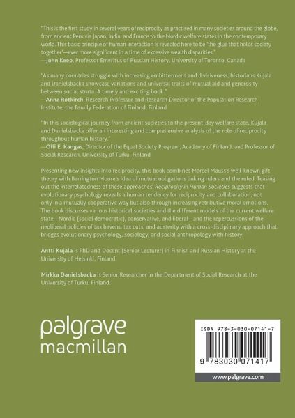 Presenting new insights into reciprocity, this book combines Marcel Mauss's well-known gift theory with Barrington Moore's idea of mutual obligations linking rulers and the ruled. Teasing out the interrelatedness of these approaches, Reciprocity in Human Societies suggests that evolutionary psychology reveals a human tendency for reciprocity and collaboration, not only in a mutually cooperative way but also through increasing retributive moral emotions. The book discusses various historical societies and the different models of the current welfare state-Nordic (social democratic), conservative, and liberal- and the repercussions of the neoliberal policies of tax havens, tax cuts, and austerity with a cross-disciplinary approach that bridges evolutionary psychology, sociology, and social anthropology with history.