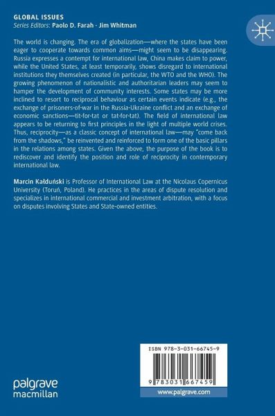 The world is changing. The era of globalization - where the states have been eager to cooperate towards common aims - might seem to be disappearing. Russia expresses a contempt for international law, China makes claim to power, while the United States, at least temporarily, shows disregard to international institutions they themselves created (in particular, the WTO and the WHO). The growing phenomenon of nationalistic and authoritarian leaders may seem to hamper the development of community interests. Some states may be more inclined to resort to reciprocal behaviour as certain events indicate (e.g., the exchange of prisoners-of-war in the Russia-Ukraine conflict and an exchange of economic sanctions - tit-for-tat or tat-for-tat). The field of international law appears to be returning to first principles in the light of multiple world crises. Thus, reciprocity - as a classic concept of international law - may "come back from the shadows," be reinvented and reinforced to formone of the basic pillars in the relations among states. Given the above, the purpose of the book is to rediscover and identify the position and role of reciprocity in contemporary international law.