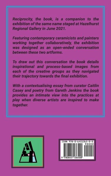 Reciprocity, the book, is a companion to the exhibition of the same name staged at Hazelhurst Regional Gallery in June 2021. Featuring contemporary ceramicists and painters working together collaboratively, the exhibition was designed as an open-ended conversation between these two artforms. Artists involved: Louisa Chircop, Kiata Mason, Jean McGhee, Tim Allen, Natalya Shinn, Tatiana Wans, Hayley West, Mirra Whale, Charmaine Pike, Ann Thompson and Agatha Pupaher. To draw out this conversation the book details inspirational and process-based images from each of the creative groups as they navigated their trajectory towards the final exhibition. The ceramicists and painters worked together over a period of 6-months. Spending time together out in the natural environment, sharing residency spaces, eating together, listening to family histories, working together in each other's studios and testing new processes. During this time the artists have come to understand the fine detail of another's practice in order to genuinely create together. Each practice inspiring and constraining the other in equal measure. This book is a record in images of the creative processes these groups undertook over this period of time. With a contextualising essay from curator Caitlin Casey and poetry from Gareth Jenkins the book provides an intimate view into the practices at play when diverse artists are inspired to make together.