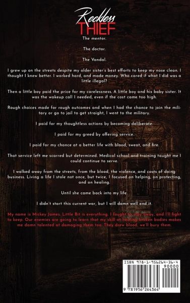 The mentor. The doctor. The Vandal. I grew up on the streets despite my older sister's best efforts to keep my nose clean. I thought I knew better. I worked hard. and made money. Who cared if what I did was a little illegal? Then a little boy paid the price for my carelessness. A little boy and his baby sister. It was the wakeup call I needed, even if the cost came too high. Rough choices made for rough outcomes and when I had the chance to join the military or go to jail to get straight, I went to the military. I paid for my thoughtless actions by becoming deliberate. I paid for my greed by offering service. I paid for my chance at a better life with blood, sweat, and fire. That service left me scarred but determined. Medical school and training taught me I could continue to serve. I walked away from the streets, from the blood, the violence, and costs of doing business. Living a life I stole not once, but twice, I focused on helping, on protecting, and on healing. Until she came back into my life. I didn't start this current war, but I will damn well end it. My name is Mickey James. Little Bit is everything. I fought to stay away, and I'll fight to keep. Our enemies are going to learn that my skill at healing broken bodies makes me damn talented at damaging them too. They drew blood, we'll bury them. RECKLESS THIEF is a full-length mature dark, new adult romance with enemies-to-lovers/love-hate themes. The dark romance aspects of this tale continue. Please be aware some situations may be uncomfortable for readers. Trigger warnings can be found in the foreword should you require them. This is a why choose novel, meaning the main character has more than one love interest. This is book eight in the series.