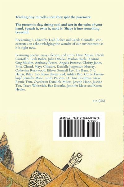Tending tiny miracles until they split the pavement. The present is clay, sitting cool and wet in the palm of your hand. Squash it, twist it, mold it. Shape it into something beautiful. Reckoning 5, edited by Leah Bobet and Cécile Cristofari, concentrates on acknowledging the wonder of our environment as it is right now. Featuring poetry, essays, fiction, and art by Hana Amani, Cécile Cristofari, Leah Bobet, Julia DaSilva, Marlon Hacla, Kristine Ong Muslim, Anthony Pearce, Angela Penrose, Christy Jones, Priya Chand, Maya Chhabra, Danielle Jorgenson Murray, Catherine Rockwood, Eileen Gunnell Lee, Liv Kane, S.L. Harris, Riley Tao, Remi Skytterstad, Ashley Bao, Corey Farrenkopf, Jennifer Mace, Sandy Parsons, D. Dina Friedman, Steve Rasnic Tem, Oyedotun Damilola Muees, Joseph Hope, Justine Teu, Tracy Whiteside, Rae Kocatka, Jennifer Mace, and Karen Heuler. Print release: July 2021 ISBN: 978-1-955360-00-5 Trade paper, perfect-bound. 238 pages; 60,000 words. Contents Art Cover: Reckoning 5 - Hana Amani Too Hot to Handle - Tracy Whiteside Nonfiction From the Editors - Cécile Cristofari From the Editors: a scribbled note in a water-damaged notebook - Leah Bobet No More Creepy Crawlies - Anthony Pearce On the Destruction and Restoration of Habitats - Priya Chand Facing Medusas - Liv Kane Poetry Salvage Song - Julia DaSilva Mula sa Melismas - Marlon Hacla From Melismas - Marlon Hacla translated by Kristine Ong Muslim you said, 'they're making the ground soft' - Christy Jones Owl Prowl - Maya Chhabra From the Embassy of Leaks to the Court of Cracks - Catherine Rockwood when the coral copies our fashion advice - Ashley Bao photolinguistics - Jennifer Mace We Have So Little Time Left - D Dina Friedman Voice of God - Joseph Hope letters from the ides - Jennifer Mace Fiction The Wild Inside - Angela Penrose Riverine - Danielle Jorgenson Murray You Cannot Return to the Burning Glade - Eileen Gunnell Lee Ash and Scar - S.L. Harris Gingko Biloba - William Tao A Song Born - Remi Skytterstad Wash'ashore Plastics Museum - Corey Farrenkopf The Talking Bears of Greikengkul - Sandy Parsons Mummies - Steve Rasnic Tem All We Have Left Is Ourselves - Oyedotun Damilola Muees SPF - Justine Teu After Me, A Flood - Rae Kocatka The Restoration - Karen Heuler
