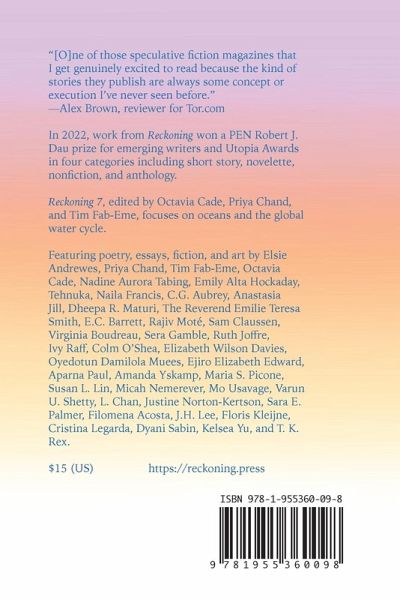 "[O]ne of those speculative fiction magazines that I get genuinely excited to read because the kind of stories they publish are always some concept or execution I've never seen before." -Alex Brown, reviewer for Tor.com Reckoning 7, edited by Octavia Cade, Priya Chand, and Tim Fab-Eme, focuses on oceans and the global water cycle. Featuring poetry, essays, fiction, and art by Elsie Andrewes, Priya Chand, Tim Fab-Eme, Octavia Cade, Nadine Aurora Tabing, Emily Alta Hockaday, Tehnuka, Naila Francis, C.G. Aubrey, Anastasia Jill, Dheepa R. Maturi, The Reverend Emilie Teresa Smith, E.C. Barrett, Rajiv Moté, Sam Claussen, Virginia Boudreau, Sera Gamble, Ruth Joffre, Ivy Raff, Colm O'Shea, Elizabeth Wilson Davies, Oyedotun Damilola Muees, Ejiro Elizabeth Edward, Aparna Paul, Amanda Yskamp, Maria S. Picone, Susan L. Lin, Micah Nemerever, Mo Usavage, Varun U. Shetty, L. Chan, Justine Norton-Kertson, Sara E. Palmer, Filomena Acosta, J.H. Lee, Floris M. Kleijne, Cristina Legarda, Dyani Sabin, Kelsea Yu, and T. K. Rex. Ebook release: January 8, 2023 Print release: July 2023 Trade paper, perfect-bound. 256 pages, 65,000 words. Contents Art Drua - Elsie Andrewes Sacral - Amanda Yskamp Essays Editorial - Priya Chand Editorial - Tim Fab-Eme Editorial - Octavia Cade A River Dance: Cauvery in Crisis - Dheepa R. Maturi From the River to the Sea - The Reverend Emilie Teresa Smith The Dream Catcher's Island - Ejiro Elizabeth Edward Fiction The Bright in the Gyre - Nadine Aurora Tabing Why We Bury Our Dead at Sea - Tehnuka A Predatory Transience - C.G. Aubrey Swimming Whole - E.C. Barrett The Air Will Catch Us - Rajiv Moté Icediver - Ruth Joffre A Song for the Selkies - Oyedotun Damilola Muees Little Apocalypses - Aparna Paul Inclement Weather - Susan L. Lin What It Means to Love a City - Mo Usavage The Sand Knows Its Way Home - L. Chan A Glass of You - Filomena Acosta Yellow River Burial - Floris M. Kleijne A Scarcity of Sharks - Kelsea Yu SQUAWKER AND DOLPHIN SWIMMING TOGETHER - T. K. Rex Poetry Lies You've Told About the Pacific Garbage Patch - Emily Alta Hockaday After encountering the grey whales in El Burbujon, Laguna Ojo de Liebre - Naila Francis Facebook Event: Run into the Category 5 Winds of a Woman Pretending to be a Hurricane - Anastasia Jill The Split-in-Half Lumberjacks - Sam Claussen Aftermath - Virginia Boudreau the world as it is - Sera Gamble In Memory of Thwaites Glacier - Ivy Raff Carbon Sink - Colm O'Shea Cantre'r Gwaelod - Elizabeth Wilson Davies Ocean Vengeance - Maria S. Picone P-T - Micah Nemerever Losing Ground - Varun U. Shetty Great Barrier Reef - Justine Norton-Kertson Reconciliation - Sara E. Palmer Sublease of Land - J.H. Lee How to Place an Intravenous Line - Cristina Legarda History of Orconectes - Dyani Sabin