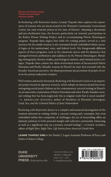 In Reckoning with Restorative Justice, Leanne Trapedo Sims explores the experiences of women who are incarcerated at the Women's Community Correctional Center, the only women's prison in the state of Hawai'i. Adopting a decolonial and pro-abolitionist lens, she focuses particularly on women's participation in the Kailua Prison Writing Project and its accompanying Prison Monologues program. Trapedo Sims argues that while the writing project served as a vital resource for the inside women, it also remained deeply embedded within carceral logics at the institutional, state, and federal levels. She foregrounds different aspects of these programs, such as the classroom spaces and the dynamics that emerged between performers and audiences in the Prison Monologues. Blending ethnography, literary studies, psychological analysis, and criminal justice critique, Trapedo Sims centers the often-overlooked stories of incarcerated Native Hawaiian and Pacific Islander women in Hawai'i in ways that resound with the broader American narrative: the disproportionate incarceration of people of color in the prison-industrial complex.