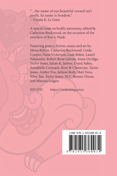 A special issueof Reckoning on bodily autonomy, edited by Catherine Rockwood, on the occasion of the overturn of Roe v. Wade. Reckoning is an award-winning journal of creative writing on environmental justice, featuring fiction, poetry, essays and art. Ebook release: October 16, 2022. Print release: March 16, 2023 Trade paper, perfect bound. 120 pages; 32,000 words. Contents Vulva Monster - Art - Moníca Robles Corzo October 16, 2022 Editorial: Naming names, claiming days. - Essay - Catherine Rockwood October 16, 2022 After the Ban - Poetry - Linda Cooper October 23, 2022 - Pushcart Nominated On This Day, and All Days, I Think About What I Have Lost - Fiction - Dana Vickerson October 30, 2022 - "I wish I could read this from a distance, but the words are too true, too well crafted, and too beautiful to ignore." -Rebecca E. Treasure fertile week - Poetry - Leah Bobet November 06, 2022 - Pushcart Nominated Ghazal for freshwater-wai - Poetry - Laurel Nakanishi November 13, 2022 - Pushcart Nominated Navy says operator error was the cause of a May fuel leak from the Red Hill Storage Facility - Poetry - Laurel Nakanishi November 13, 2022 Law - Poetry - Robert René Galván November 20, 2022 Wild Winter Rose - Fiction - Anna Orridge November 27, 2022 Bosque Nuboso: Terra Firma - Art - Taylor Jones November 27, 2022 Terrestrial Bodies - Poetry - Julian K. Jarboe December 04, 2022 This is a romantic comedy - Poetry - Dyani Sabin December 11, 2022 Charcuterie - Poetry - Annabelle Cormack December 18, 2022 A Question of Choice - Fiction - Rimi B. Chatterjee December 25, 2022 Bosque Nuboso: Like Someone Humming Against My Palm - Art - Taylor Jones January 01, 2023 Ghost of a Chance: A Trans Girl Tries to Live - Essay - Amber Fox January 01, 2023 Roses in Washington Square Park - Poetry - Juliana Roth January 08, 2023 Green Leaves Against the Wind - Poetry - Mari Ness January 15, 2023 Hangs Heavy On Their Head - Fiction - Riley Tao January 22, 2023 Bosque Nuboso: Nocturne - Art - Taylor Jones January 29, 2023 Those Dark Halls - Fiction - M.C. Benner Dixon February 05, 2023 Exception - Poetry - Marissa Lingen February 12, 2023