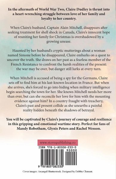 In the aftermath of World War Two, Claire Dudley is thrust into a heart-wrenching struggle between love of her family and loyalty to her country. When Claire's husband, Captain Alain Mitchell, disappears after seeking treatment for shell shock in Canada, Claire's innocent hope of reuniting her family for Christmas is overshadowed by a growing unease. Haunted by her husband's cryptic mutterings about a woman named Simone before he disappeared, Claire embarks on a quest to uncover the truth. She draws on her past as a fearless member of the French Resistance to confront the harsh realities of the present: the war may be over, but danger still lurks at every turn. When Mitchell is accused of being a spy for the Germans, Claire sets off to find him at his last-known location in France. But when she arrives, she's forced to go into hiding when military intelligence begin searching the town for her. She knows Mitchell needs her more than ever, but can she reconcile her love for him with the mounting evidence against him? In a country fraught with treachery, Claire's past and present collide as she unearths a painful reality hidden beneath the shadows of betrayal. You will be captivated by Claire's journey of courage and resilience in this gripping and emotional wartime story. Perfect for fans of Mandy Robotham, Glynis Peters and Rachel Wesson.
