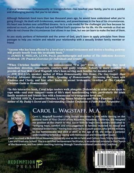 Anyone who has been affected by a loved one's sexual brokenness and desires a healing pathway will greatly benefit from this invaluable book. -James E. Phelan, LCSW, Psy.D, psychotherapist and author of The Addictions Recovery Workbook: 101 Practical Exercises for Individuals and Groups When Christian families hear the announcement "I'm gay" from a loved one, they need immediate direction, reassurance, comfort, and godly wisdom. Nobody is more qualified to provide all four than Carol Wagstaff, who's been serving such families for decades now. -Joe Dallas, speaker; author of When Homosexuality Hits Home, The Gay Gospel: How Pro-Gay Advocates Misread the Bible, Speaking of Homosexuality: Discussing the Issues with Kindness and Clarity, and four other books on sexual brokenness; co-editor of The Complete Christian Guide to Homosexuality In this interactive book, Carol helps readers walk alongside [Nehemiah] in order to see ways to cope with-and even conquer-some of life's most heartbreaking trials, particularly the trials family members and friends face with a homosexual or transgender loved one. -Denise Shick, executive director, Living Stones Ministries and Help 4 Families; author of My Daddy's Secret and Understanding Gender Confusion: A Faith-Based Perspective If sexual brokenness-homosexuality or transgenderism-has touched your family, you're on a painful and challenging journey. But you're not alone. Although Nehemiah lived more than two thousand years ago, he would have understood what you're going through. He dealt with brokenness, weakness, and powerlessness in the face of his circumstances. His heart was broken over unfulfilled dreams. He is a role model for the challenges you face because he endured so much, yet he obeyed God and fulfilled God's purposes for his life. His life reminds us that we often do not choose the circumstances God allows in our lives, but we can learn to make the best of them. As you study portions of Nehemiah and the armor of God, you'll learn to apply principles from these passages to help you reclaim and rebuild your relationship with a sexually broken family member or friend.