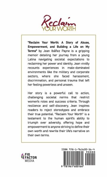 "Reclaim Your Worth: A Story of Abuse, Empowerment, and Building a Life on My Terms" by Jean Ibáñez Payne is a gripping memoir detailing her journey from a young Latina navigating societal expectations to reclaiming her power and identity. Jean vividly recounts experiences in male-dominated environments like the military and corporate sectors, where she faced harassment, discrimination, and personal trauma that left her feeling powerless and unseen. Her story is a powerful call to action, challenging societal norms that restrict women's roles and success criteria. Through resilience and self-discovery, Jean inspires readers to reject stereotypes and embrace their true potential. "Reclaim Your Worth" is a testament to the human spirit's ability to triumph over adversity, offering hope and empowerment to anyone striving to define their own worth and rewrite their life's narrative on their own terms.