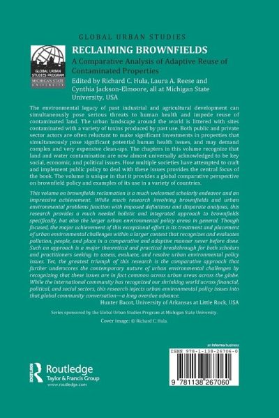 I: Policy 1: Incentives for Collaboration 2: Changing Agendas in State Environmental Policy 3: Revitalizing Contaminated Land in Italy, the United Kingdom and the United States 4: Redevelopment Strategy of Brownfield Sites in the Czech Republic II: Implementation and Evaluation 5: Exploring the Potential for Integrating Community Benefits Agreements into Brownfield Redevelopment Projects 6: The Quantitative and Qualitative Impacts of Brownfield Policies in England 7: New Urban Communities 8: The Inertia of Environmental Regulatory Enforcement in China 9: Strategic Land Management in Germany III: Brownfield Case Studies 10: Fostering Brownfields Development in Rust Belt Cities 11: Institutional Network Management in Brownfield Cleanup and Redevelopment 12: From Blighted Brownfields to Healthy and Sustainable Communities 13: Michigan Brownfield Redevelopment Innovation