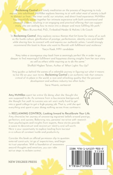 Amy McMillen spent her entire life doing what she thought she was supposed to do. As someone from a low-income background, she thought her path to success was set: work really hard to get into a good college to get a high paying job. That is, until she quit everything and spent a year doing nothing across three continents. In Reclaiming Control: Looking Inward to Recalibrate Your Life, Amy chronicles her journey of uncovering ingrained beliefs around prestige, perfection, and success. Balancing raw, personal narrative with research from psychologists and insights from experts, these stories provide a space to deconstruct and reconstruct identity and self-worth. Here is your opportunity to explore healing from burnout in a culture of constant hustle and productivity. Consider this book an official permission slip to question external constructs, let go of expectations, and begin to trust yourselves. With a foundation of awareness around thoughts and emotions, you can take active steps to reclaim control.
