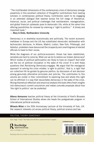 Democracy is in shambles economically and politically. The recent economic meltdown in Europe and the U.S. has substituted democratic deliberation with technocratic decisions. In Athens, Madrid, Lisbon, New York, Pittsburgh or Istanbul, protesters have denounced the incapacity and unwillingness of elected officials to heed to their voices. While the diagnosis of our political-economic illness has been established, remedies are hard to come. What can we do to restore our broken democracy? Which modes of political participation are likely to have an impact? And what are the loci of political innovation in the wake of the crisis? It is with these questions that Reclaiming Democracy engages. We argue that the managerial approach to solving the crisis violates 'a right to politics', that is, a right that our collective life be guided by meaningful politics: by discussion of and decision among genuinely alternative principles and policies. The contributors to this volume are united in their commitment to explore how and where this right can be affirmed in a way that resuscitates democracy in the wake of the crisis. Mixing theoretical reflection and empirical analysis the book offers fresh insights into democracy's current conundrum and makes concrete proposals about how 'the right to politics' can be protected.