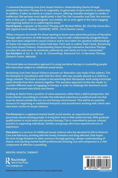 Reclaiming Lives from Sexual Violence presents an illustrative case study of the authors, Tim the therapist in consultation with Dale the client, who was sexually abused as a child by a clergy member. The book is unique in documenting their therapeutic work using transcripts taken directly from their sessions together. This narrative approach invites the reader to consider different ways of engaging in therapy in order to challenge the dominant social discourses around masculinity and shame.