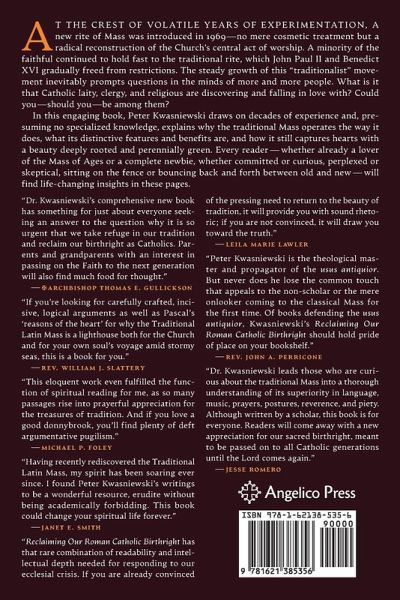 In this engaging book, Peter Kwasniewski draws on decades of experience and explains the distinctive features of the traditional Mass and how it still captures hearts. Every reader-whether already a lover of the traditional Mass or a newbie, whether committed or curious, perplexed or skeptical-will find life-changing insights in these pages.