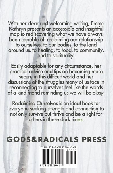 In this time of economic, social, and environmental collapse, we cannot rely on governments or leaders to guide us through the chaos. Yet this is no reason for despair, because these crises open old doors we thought rusted shut and old paths we thought too overgrown to ever find again. Reclaiming Ourselves is a guide to those paths and a key to those doors. With her clear and welcoming writing, Emma Kathryn presents an accessible and insightful map to rediscovering what we have always been capable of: reclaiming our relationship to ourselves, to our bodies, to the land around us, to healing, to food, to community, and to spirituality. Easily adaptable for any circumstance, her practical advice and tips on becoming more secure in this difficult world and her discussions of the struggles many of us face in reconnecting to ourselves feel like the words of a kind friend reminding us we will be okay. Reclaiming Ourselves, by Emma Kathryn, is an ideal book for everyone seeking strength and connection to not only survive but thrive and be a light for others in these dark times.