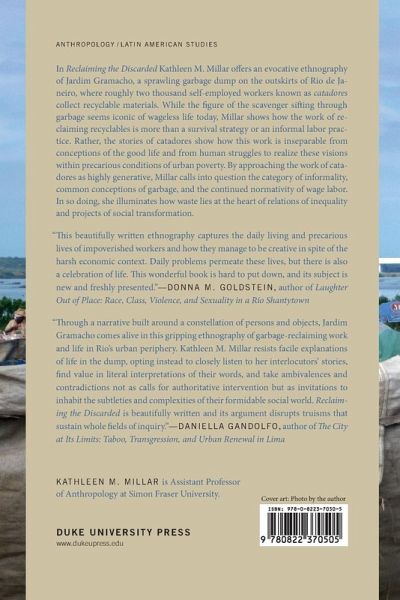 In Reclaiming the Discarded Kathleen M. Millar offers an evocative ethnography of Jardim Gramacho, a sprawling garbage dump on the outskirts of Rio de Janeiro, where roughly two thousand self-employed workers known as catadores collect recyclable materials. While the figure of the scavenger sifting through garbage seems iconic of wageless life today, Millar shows how the work of reclaiming recyclables is more than a survival strategy or an informal labor practice. Rather, the stories of catadores show how this work is inseparable from conceptions of the good life and from human struggles to realize these visions within precarious conditions of urban poverty. By approaching the work of catadores as highly generative, Millar calls into question the category of informality, common conceptions of garbage, and the continued normativity of wage labor. In so doing, she illuminates how waste lies at the heart of relations of inequality and projects of social transformation.