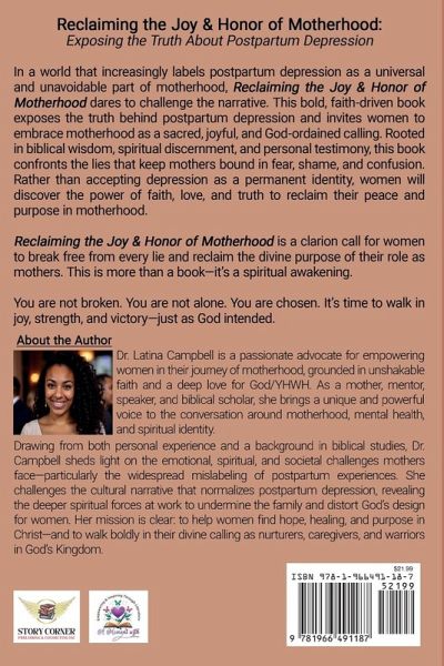 Reclaiming the Joy & Honor of Motherhood: Exposing the Truth About Postpartum Depression In a world that increasingly labels postpartum depression as a universal and unavoidable part of motherhood, Reclaiming the Joy & Honor of Motherhood dares to challenge the narrative. This bold, faith-driven book exposes the truth behind postpartum depression and invites women to embrace motherhood as a sacred, joyful, and God-ordained calling. Rooted in biblical wisdom, spiritual discernment, and personal testimony, this book confronts the lies that keep mothers bound in fear, shame, and confusion. Rather than accepting depression as a permanent identity, women will discover the power of faith, love, and truth to reclaim their peace and purpose in motherhood. Reclaiming the Joy & Honor of Motherhood is a clarion call for women to break free from every lie and reclaim the divine purpose of their role as mothers. This is more than a book-it's a spiritual awakening. You are not broken. You are not alone. You are chosen. It's time to walk in joy, strength, and victory-just as God intended. About the Author Dr. Latina Campbell is a passionate advocate for empowering women in their journey of motherhood, grounded in unshakable faith and a deep love for God/YHWH. As a mother, mentor, speaker, and biblical scholar, she brings a unique and powerful voice to the conversation around motherhood, mental health, and spiritual identity. Drawing from both personal experience and a background in biblical studies, Dr. Campbell sheds light on the emotional, spiritual, and societal challenges mothers face-particularly the widespread mislabeling of postpartum experiences. She challenges the cultural narrative that normalizes postpartum depression, revealing the deeper spiritual forces at work to undermine the family and distort God's design for women. Her mission is clear: to help women find hope, healing, and purpose in Christ-and to walk boldly in their divine calling as nurturers, caregivers, and warriors in God's Kingdom.