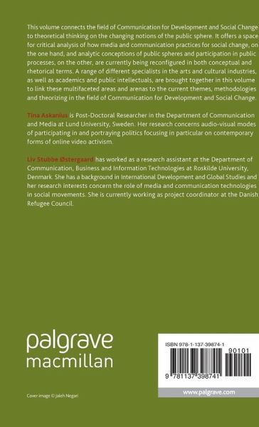 List of Figures List of Tables Notes on Contributors Introduction; Tina Askanius and Liv Østergaard PART I: THEORISING COMMUNICATION FOR CHANGE AND THE TRANSFORMATION OF PUBLIC SPHERES 1. Voiceblind: Beyond the Paradoxes of the Neoliberal State; Nick Couldry 2. Researching and Developing Cybercultur@: Emerging Local Knowledge Communities in Latin America; Jorges A. Gonzalez 3. Advocacy Communication for and about Women; Karin Gwinn Wilkins 4. The Public Sphere and the Dialectics of Globalization; Thomas Hylland Eriksen PART II: CONTEMPORARY ACTORS OF SOCIAL CHANGE: ART, TECHNOLOGY AND PUBLIC PEDAGOGY 5. What is an Intellectual, Anyway?; Ingrid Elam 6. What I Think About when I Think About Being an Intellectual; Carsten Jensen Round-table Discussion led by Thomas Hylland Eriksen, moderated by Oscar Hemer: The Flattening of the Public Sphere and the Loss of Respect for Knowledge 7. Interview with Måns Adler by Liv Østergaard: The Democratization of Live Streaming Tools 8. Beyond Polemical Practice: A Tribute to Henry Gireoux; Geetanjali Sachdev PART III: PRACTITIONERS AND PRACTICES: NEW COMMUNICATION FOR SOCIAL CHANGE PERSPECTIVES AND INITIATIVES 9. Public Discourses on Gender, Modernity, and Assaults on Women in India; Jyothsna Belliappa 10. Participation in the Internet Era; Rikke Frank Jørgensen 11. Communication in Social Movements: A New Perspective on Human Right; Cicilia M. Krohling Peruzzo 12. Citizen Engagement Through SMS? Audiences 'Talking Back' to a Reality TV Edutainment Initiative in Tanzania; Ylva Ekström and Linda Helgesson 13. Accessing the Public Sphere in Africa Through a Slum Radio Project; Nicky Morrison and Martin Davies Afterword: Addressing The Challenges of the Present Continous; Oscar Hemer and Thomas Tufte