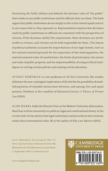Reclaiming the Public defines and defends the intrinsic value of "the public" that resides in our public institutions and the officials that run them. The book argues that public institutions do not simply act for us but instead speak and act in our name; i.e., they represent us. Representation requires that decisions made by public institutions or officials are consistent with the perspectives of citizens. If the decisions satisfy this requirement, these decisions are attributable to citizens, and citizens can be held responsible for them. This theory of political authority accounts for major features of our legal system, such as the non-instrumental grounds for the separation of law-making powers, the non-instrumental value of constitutions, the limits of privatization, the nature and value of public property, and the impermissibility of using artificial intelligence in setting certain policies and making certain decisions.