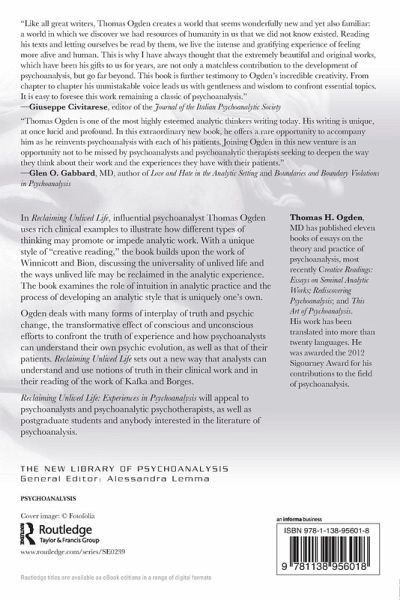 "Like all great writers, Thomas Ogden creates a world that seems wonderfully new and yet also familiar: a world in which we discover that we had resources of humanity in us that we did not know existed. Reading his texts and letting ourselves be read by them, we live the intense and gratifying experience of feeling more alive and more human. This is why I have always thought that the extremely beautiful and original works which have been his gifts to us for years, are not only a matchless contribution to the development of psychoanalysis, and not only ensure that it remains something worthy of our lifelong passion, but go far beyond psychoanalysis. Reclaiming Unlived Lives: Experiences in Psychoanalysis is simply further testimony to Ogden's incredible creativity. From chapter to chapter his unmistakable voice leads us with gentleness and wisdom to confront essential topics such as truth, dream-thought, missing forms of life, the aesthetic experience in the session, Borges and Kafka, the interface between literature and psychoanalysis. A delightful conversation with Luca Di Donna ends the book. It is easy to foresee this work remaining a classic of psychoanalysis."-Giuseppe Civitarese, editor of the Journal of the Italian Psychoanalytic Society.