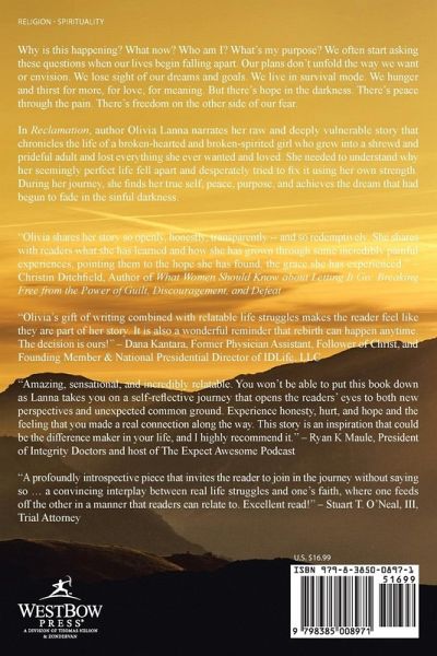 Why is this happening? What now? Who am I? What's my purpose? We often start asking these questions when our lives begin falling apart. Our plans don't unfold the way we want or envision. We lose sight of our dreams and goals. We live in survival mode. We hunger and thirst for more, for love, for meaning. But there's hope in the darkness. There's peace through the pain. There's freedom on the other side of our fear. In Reclamation, author Olivia Lanna narrates her raw and deeply vulnerable story that chronicles the life of a broken-hearted and broken-spirited girl who grew into a shrewd and prideful adult and lost everything she ever wanted and loved. She needed to understand why her seemingly perfect life fell apart and desperately tried to fix it using her own strength. During her journey, she finds her true self, peace, purpose, and achieves the dream that had begun to fade in the sinful darkness. "Olivia shares her story so openly, honestly, transparently -- and so redemptively. She shares with readers what she has learned and how she has grown through some incredibly painful experiences, pointing them to the hope she has found, the grace she has experienced." -Christin Ditchfield, Author of What Women Should Know about Letting It Go: Breaking Free from the Power of Guilt, Discouragement, and Defeat "Olivia's gift of writing combined with relatable life struggles makes the reader feel like they are part of her story. It is also a wonderful reminder that rebirth can happen anytime. The decision is ours!" - Dana Kantara, Former Physician Assistant, Follower of Christ, and Founding Member & National Presidential Director of IDLife, LLC "Amazing, sensational, and incredibly relatable. You won't be able to put this book down as Lanna takes you on a self-reflective journey that opens the readers' eyes to both new perspectives and unexpected common ground. Experience honesty, hurt, and hope and the feeling that you made a real connection along the way. This story is an inspiration that could be the difference maker in your life, and I highly recommend it." - Ryan K Maule, President of Integrity Doctors and host of The Expect Awesome Podcast "A profoundly introspective piece that invites the reader to join in the journey without saying so ... a convincing interplay between real life struggles and one's faith, where one feeds off the other in a manner that readers can relate to. Excellent read!" - Stuart T. O'Neal, III, Trial Attorney