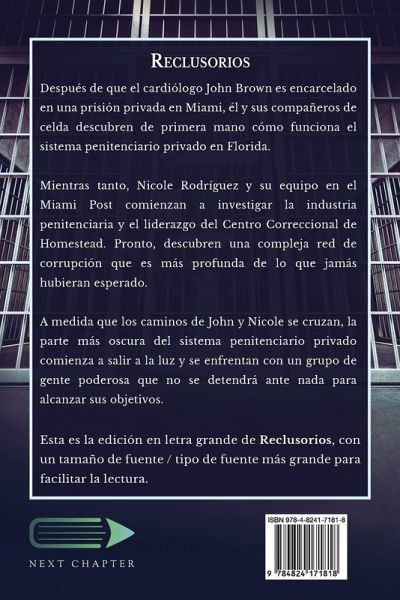 Después de que el cardiólogo John Brown es encarcelado en una prisión privada en Miami, él y sus compañeros de celda descubren de primera mano cómo funciona el sistema penitenciario privado en Florida. Mientras tanto, Nicole Rodríguez y su equipo en el Miami Post comienzan a investigar la industria penitenciaria y el liderazgo del Centro Correccional de Homestead. Pronto, descubren una compleja red de corrupción que es más profunda de lo que jamás hubieran esperado. A medida que los caminos de John y Nicole se cruzan, la parte más oscura del sistema penitenciario privado comienza a salir a la luz y se enfrentan con un grupo de gente poderosa que no se detendrá ante nada para alcanzar sus objetivos. Esta es la edición en letra grande de Reclusorios, con un tamaño de fuente / tipo de fuente más grande para facilitar la lectura.