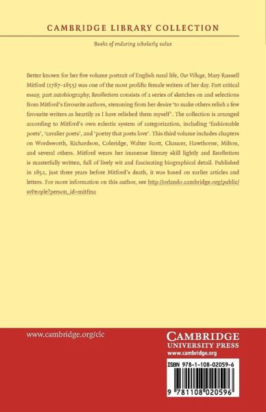 Better known for her five volume portrait of English rural life, Our Village, Mary Russell Mitford (1787-1855) was one of the most prolific female writers of her day. Part critical essay, part autobiography, Recollections consists of a series of sketches on and selections from Mitford's favourite authors, stemming from her desire 'to make others relish a few favourite writers as heartily as I have relished them myself'. The collection is arranged according to Mitford's own eclectic system of categorization including 'fashionable poets', 'cavalier poets', and 'poetry that poets love'. This third volume includes chapters on Wordsworth, Richardson, Coleridge, Walter Scott, Chaucer, Hawthorne, Milton, and several others. Mitford wears her immense literary skill lightly and Recollections is masterfully written, full of lively wit and fascinating biographical detail. Published just three years before Mitford's death, it was based on earlier articles and letters.