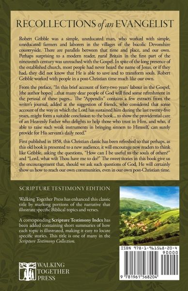 Robert Gribble was a simple, uneducated man, who worked with simple, uneducated farmers and laborers in the villages of the bucolic Devonshire countryside. There are parallels between that time and place, and our own. Perhaps surprising to a modern reader, rural Britain in the first part of the nineteenth century was unreached with the Gospel. In spite of the long presence of the established church, most people had never heard the name of Jesus, or if they had, they did not know that He is able to save and to transform souls. Robert Gribble worked with people in a post-Christian time much like our own. From the preface, "In this brief account of forty-two years' labour in the Gospel, [the author hopes] ...that many dear people of God will find some refreshment in the perusal of these pages... The "Appendix" contains a few extracts from the writer's journal, added at the suggestion of friends, who considered that some account of the way in which the Lord has sustained him during the last twenty-five years, might form a suitable conclusion to the book... to show the providential care of an Heavenly Father who delights to help those who trust in Him, and who, if able to raise such weak instruments in bringing sinners to Himself, can surely provide for His servant's daily need." First published in 1858, this Christian classic has been refreshed so that perhaps, as this old book is presented to a new audience, it will encourage new readers to think like Gribble, asking the questions, "How can I be useful to the souls of others?" and "Lord, what wilt Thou have me to do?" The sweet stories in this book give us the encouragement that, should we ask such questions of God, He will certainly show us how to reach our own communities, even in our own post-Christian time.