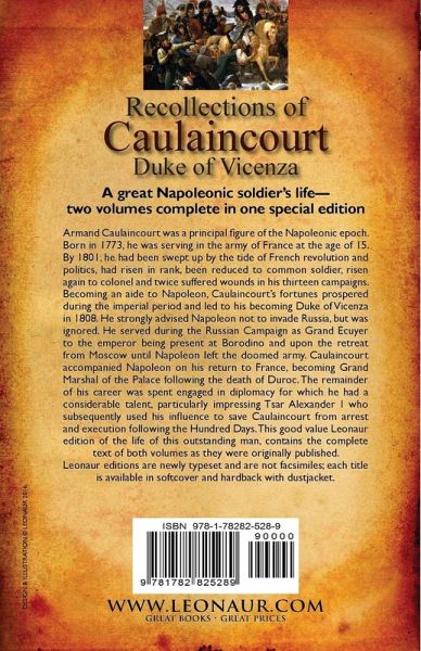 A great Napoleonic soldier's life-two volumes complete in one special edition Armand Caulaincourt was a principal figure of the Napoleonic epoch. Born in 1773, he was serving in the army of France at the age of 15. By 1801, he had been swept up by the tide of French revolution and politics, had risen in rank, been reduced to common soldier, risen again to colonel and twice suffered wounds in his thirteen campaigns. Becoming an aide to Napoleon, Caulaincourt's fortunes prospered during the imperial period and led to his becoming Duke of Vicenza in 1808. He strongly advised Napoleon not to invade Russia, but was ignored. He served during the Russian Campaign as Grand Ecuyer to the emperor being present at Borodino and upon the retreat from Moscow until Napoleon left the doomed army. Caulaincourt accompanied Napoleon on his return to France, becoming Grand Marshal of the Palace following the death of Duroc. The remainder of his career was spent engaged in diplomacy for which he had a considerable talent, particularly impressing Tsar Alexander I who subsequently used his influence to save Caulaincourt from arrest and execution following the Hundred Days. This good value Leonaur edition of the life of this outstanding man, contains the complete text of both volumes as they were originally published. Leonaur editions are newly typeset and are not facsimiles; each title is available in softcover and hardback with dustjacket.