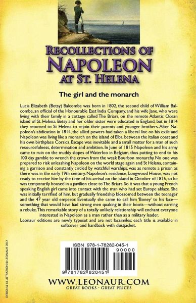 The girl and the monarch Lucia Elizabeth (Betsy) Balcombe was born in 1802, the second child of William Balcombe, an official of the Honourable East India Company, and his wife Jane, who were living with their family in a cottage called The Briars, on the remote Atlantic Ocean island of St. Helena. Betsy and her older sister were educated in England, but in 1814 they returned to St Helena to rejoin their parents and younger brothers. After Napoleon's abdication in 1814, the allied powers had taken a liberal line on his exile and Napoleon was living like a monarch on the island of Elba, between the Italian coast and his own birthplace Corsica. Escape was inevitable and a small matter for a man of such resourcefulness, determination and ambition. In June of 1815 Napoleon and his army came to ruin on the muddy slopes of Waterloo in Belgium, thus putting to end to his 100 day gamble to wrench the crown from the weak Bourbon monarchy. No one was prepared to risk unleashing Napoleon on the world stage again and St Helena, containing a garrison and constantly circled by watchful warships, was as remote a prison as there was in the early 19th century. Napoleon's residence, Longwood House, was not ready to receive him by the time of his arrival on the island in October of 1815, so he was temporarily housed in a pavilion close to The Briars. So it was that a young French speaking English girl came into contact with the man who had set Europe ablaze. She was initially terrified of him, but gradually friendship blossomed between the teenager and the 47 year old emperor. Eventually she came to call him 'Boney' to his face-something that would have had strong men quaking in their boots-without earning a rebuke. This remarkable story of a totally unlikely relationship will enchant everyone interested in Napoleon as a man rather than as a military leader. Leonaur editions are newly typeset and are not facsimiles; each title is available in softcover and hardback with dustjacket.