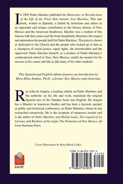 In 1903 Pedro Sanchez published his "Memorias, or Recollections of the Life of the Priest Don Antonio Jose Martinez." This rare book, written in Spanish, is hailed by historians and others as an important and unique contribution to the literary history of New Mexico and the American Southwest. Sanchez was a student of this famous folk hero priest and the book beautifully illustrates the respect and admiration the people held for Padre Martinez. The priest is shown as dedicated to the Church and the people who looked up to him as a champion of social justice, equal rights, the downtrodden and the oppressed. Pedro Sanchez himself, as a product of Padre Martinez's coeducational school in Taos, New Mexico, credits his mentor for his success in his career and life as did many of his other students. This Spanish and English edition features an introduction by Myra Ellen Jenkins, Ph.D., a former New Mexico state historian. Ray John de Aragón, a leading scholar on Padre Martinez and the authority on his life and work, translated the original Spanish text of the Sanchez book into English. De Aragón has a Masters in American Studies and has been a keynote speaker at public and historical conferences on Padre Martinez whom he has researched extensively. He is the recipient of numerous awards and is the author of "Padre Martinez and Bishop Lamy," "The Legend of La Llorona," and "Brothers of the Light, The Penitentes of New Mexico," all from Sunstone Press.