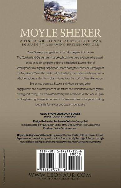 A finely written account of the war in Spain by a serving British officer Moyle Sherer, a young officer of the 34th Regiment of Foot-The Cumberland Gentlemen-has brought a writers eye and pen to his experiences of life on campaign and on the battlefield as a member of Wellington's Army fighting Napoleon's French during the Peninsular Campaign of the Napoleonic Wars. The reader will be treated to rare detail of action, countryside, friends, foes and uniform often missing from the works of less able authors. Sherer was present at Busaso and Albuera among other engagements and his descriptions of the actions and their aftermaths are graphic, riveting and chilling. This red-coated infantryman's chronicle of the war in Spain has long been highly regarded as one of the best memoirs of the period making it essential for serious and casual students alike.