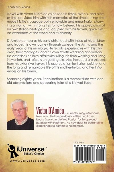 Travel with Victor D¿Amico as he recalls times, events, and places that provided him with rich memories of the simple things that made his life¿s passage both enjoyable and meaningful. Marrying a woman with strong ties to Italy fostered his appreciation of his own Italian heritage and, coupled with his travels, gave him an awareness of the world and its diversity. D¿Amico compares his early childhood with those of his children and traces his own journey through college, the Army, and the early years of his marriage. He recalls experiences with his children, their marriages, and his own fiftieth wedding anniversary. He describes his love affair with skiing, his time working and living in Munich, and reflects on getting old. Also included are snippets from his extensive travels, his appreciation for Italian cuisine, and the long and remarkable life of his mother-in-law and her influences on his family. Spanning eighty years, Recollections is a memoir filled with candid observations and appealing tales of a life well lived.