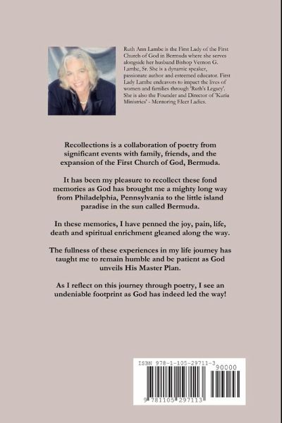 Recollections is a collaboration of poetry from significant events with family, friends, and the expansion of the First Church of God, Bermuda. Mrs. Ruth Ann Lambe, wife of Bishop Vernon Lambe recollects her fondest memories the share how God has brought her a mighty long way from Philadelphia, Pennsylvania to the little island paradise in the sun called Bermuda. In these memories, she penned the joy, pain, life, death and spiritual enrichment gleaned along the way. The fullness of these experiences in her life journey has taught her to remain humble and be patient as God unveils His Master Plan. As she reflect on this journey through poetry, she sees an undeniable footprint as God has indeed led the way!
