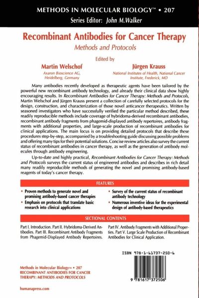 "...the book is well written and the experimental protocols that were included are described in great detail...this book is a valuable resource both for persons new to this field to get an overview of current activities and for those already in the field to look up specific areas that are covered." -Clinical Immunology "Overall the book is a helpful resource, especially for molecular biologists involved in generating antibody fragments, collecting up to date protocols in one convenient volume." - Pharmaceutical Research