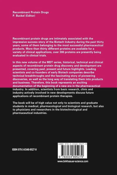 Recombinant protein drugs are intimately associated with the impressive success story of the Biotech Industry during the past thirty years, some of them belonging to the most successful pharmaceutical products. More than thirty different proteins are available for a variety of clinical applications, over 300 proteins are presently being evaluated in clinical trials. In this new volume of the MDT series, historical, technical and clinical aspects of recombinant protein drug discovery and development are presented, covering past, present and future highlights. Leading scientists and co-founders of early Biotech companies describe technical breakthroughs and the fascinating story of pioneering discoveries, as well as the long way of translating them into products and business. Therefore, this book represents an exciting documentation of the beginning of a new era in the pharmaceutical industry. In addition, scientists from basic research, clinic and industry actively involved in newdevelopments discuss...