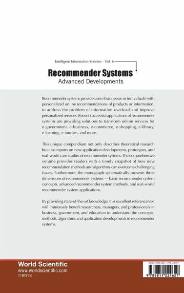 Recommender systems provide users (businesses or individuals) with personalized online recommendations of products or information, to address the problem of information overload and improve personalized services. Recent successful applications of recommender systems are providing solutions to transform online services for e-government, e-business, e-commerce, e-shopping, e-library, e-learning, e-tourism, and more. This unique compendium not only describes theoretical research but also reports on new application developments, prototypes, and real-world case studies of recommender systems. The comprehensive volume provides readers with a timely snapshot of how new recommendation methods and algorithms can overcome challenging issues. Furthermore, the monograph systematically presents three dimensions of recommender systems - basic recommender system concepts, advanced recommender system methods, and real-world recommender system applications. By providing state-of-the-art knowledge, this excellent reference text will immensely benefit researchers, managers, and professionals in business, government, and education to understand the concepts, methods, algorithms and application developments in recommender systems.