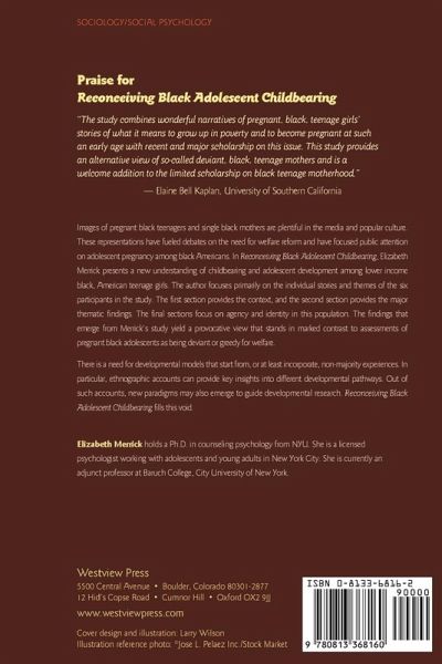 Images of pregnant Black teenagers and single Black mothers are plentiful in the media and popular culture. These representations have fueled debates on the need for welfare reform and have focused public attention on adolescent pregnancy among Black Americans. In Reconceiving Black Adolescent Pregnancy, Elizabeth Merrick presents a new understanding of childbearing and adolescent development among lower income Black American teenage girls. The author focuses primarily on the individual stories and themes of the six participants in the study. The first section provides the context, and the second section provides the major thematic findings. The final sections focus on agency and identity in this population. The findings that emerged from Merrick's study yield a provocative view that stands in marked contrast to assessments of pregnant Black adolescents as being deviant or greedy for welfare. There is a need for developmental models that start from, or at least incorporate, non-majority experiences. In particular, ethnographic accounts can provide key insights into different developmental pathways. Out of such accounts, new paradigms may also emerge to guide developmental research. Reconceiving Black Adolescent Pregnancy fills this void.