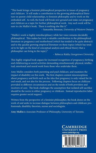 This book argues for increased recognition of pregnancy, birthing and childrearing as social activities demanding simultaneously physical, intellectual, emotional and moral work from those who undertake them. Amy Mullin considers both parenting and paid childcare, and examines the impact of disability on this work. The first chapters contest misconceptions about pregnancy and birth such as the idea that pregnancy is only valued for its end result, and not for the process. Subsequent chapters focus on childcare provided in different circumstances and on the needs of both providers and receivers of care.
