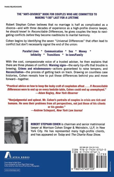 THE "ANTI-DIVORCE" BOOK FOR COUPLES WHO ARE COMMITTED TO MAKING "I DO" LAST FOR A LIFETIME Robert Stephan Cohen believes that no marriage is half as complicated as a divorce -- and with three decades of experience as a high-profile divorce lawyer, he should know! In Reconcilable Differences, he gives couples the keys to navigating conflicts before they become roadblocks to marital harmony. Cohen begins by identifying the seven "Universal Differences" that often lead to conflict but don't necessarily signal the end of the union: Parallel Lives Communication Sex Money Infidelity Transitions In-laws/Family With the cool, compassionate voice of a trusted adviser, he then explains that there are three phases of conflict: Warning signs -- the early tip-offs that trouble is brewing; Crimes and misdemeanors -- actions guaranteed to raise tempers; and Reconciliation -- the process of getting back on track. Drawing on countless case histories, Cohen reveals how to put these differences behind you and move forward -- together.