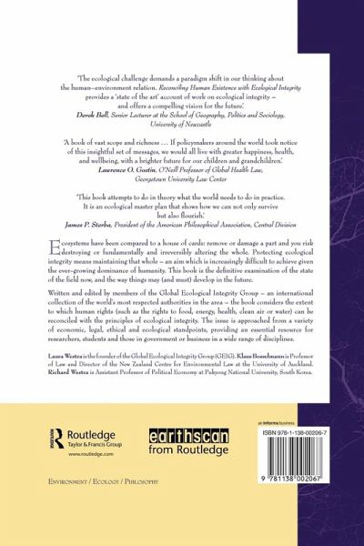 'The ecological challenge demands a paradigm shift in our thinking about the human-environment relation. Reconciling Human Existence with Ecological Integrity provides a 'state of the art account of work on ecological integrity - and offers a compelling vision for the future. Derek Bell, Senior Lecturer at the School of Geography, Politics and Sociology, University of Newcastle A book of vast scope and richness ... If policymakers around the world took notice of this insightful set of messages, we would all live with greater happiness, health, and wellbeing, with a brighter future for our children and grandchildren. Lawrence O. Gostin, O'Neill Professor of Global Health Law, Georgetown University Law Center This book attempts to do in theory what the world needs to do in practice. It is an ecological master plan that shows how we can not only survive but also flourish. James P. Sterba, President of the American Philosophical Association, Central Division Ecosystems have been compared to a house of cards: remove or damage a part and you risk destroying or fundamentally and irreversibly altering the whole. Protecting ecological integrity means maintaining that whole - an aim which is increasingly difficult to achieve given the ever-growing dominance of humanity. This book is the definitive examination of the state of the field now, and the way things may (and must) develop in the future. Written and edited by members of the Global Ecological Integrity Group - an international collection of the worlds most respected authorities in the area - the book considers the extent to which human rights (such as the rights to food, energy, health, clean air or water) can be reconciled with the principles of ecological integrity. The issue is approached from a variety of economic, legal, ethical and ecological standpoints, providing an essential resource for researchers, students and those in government or business in a wide range of disciplines.